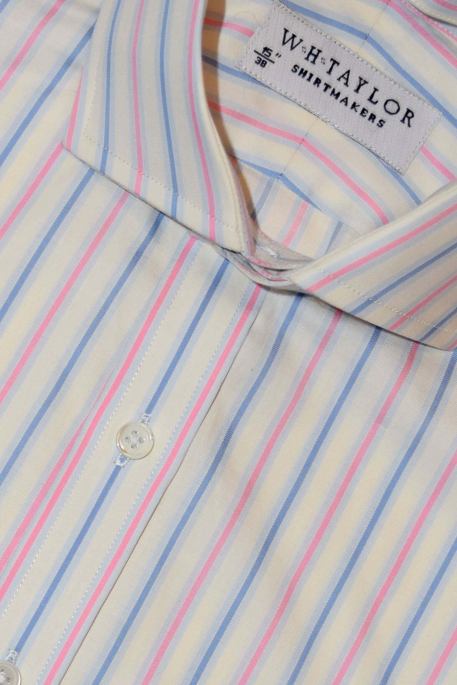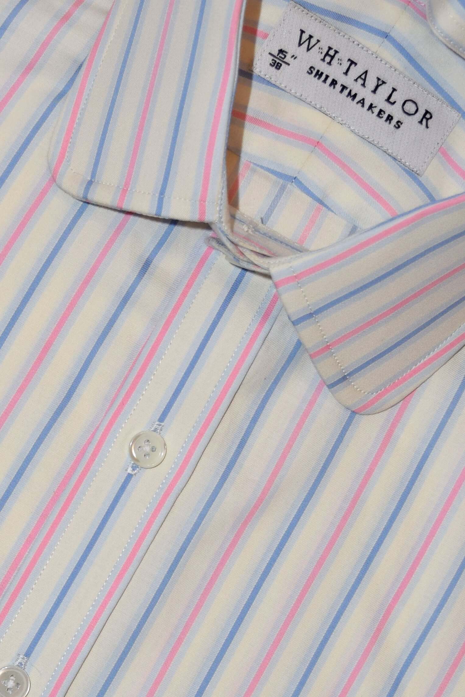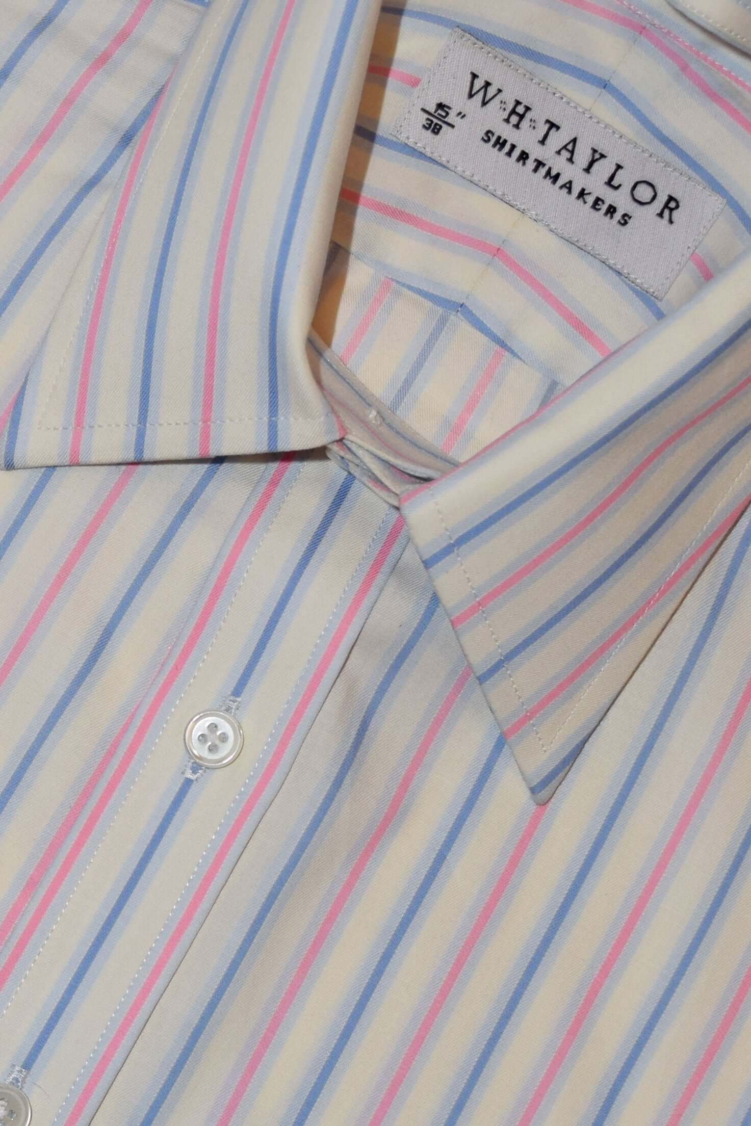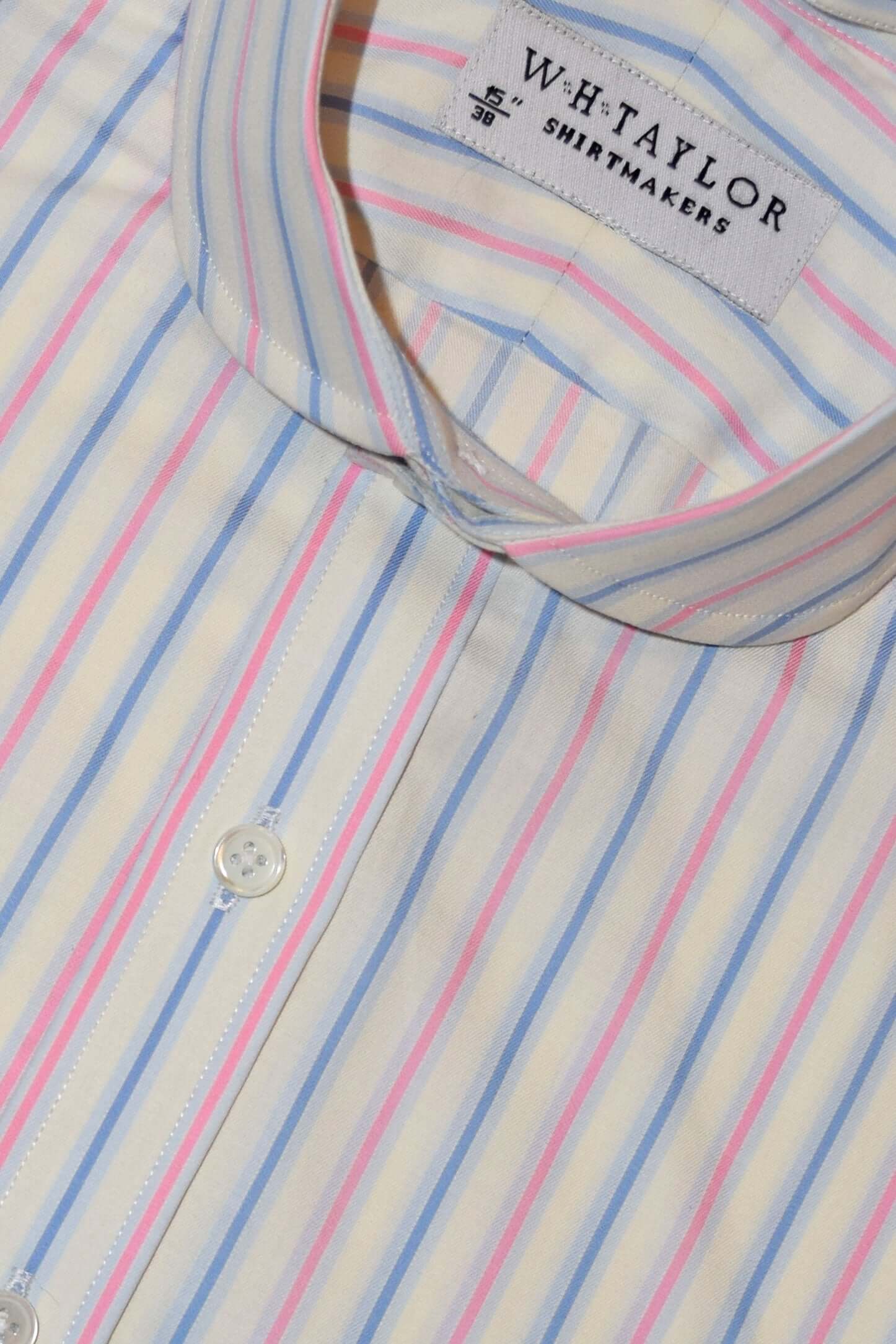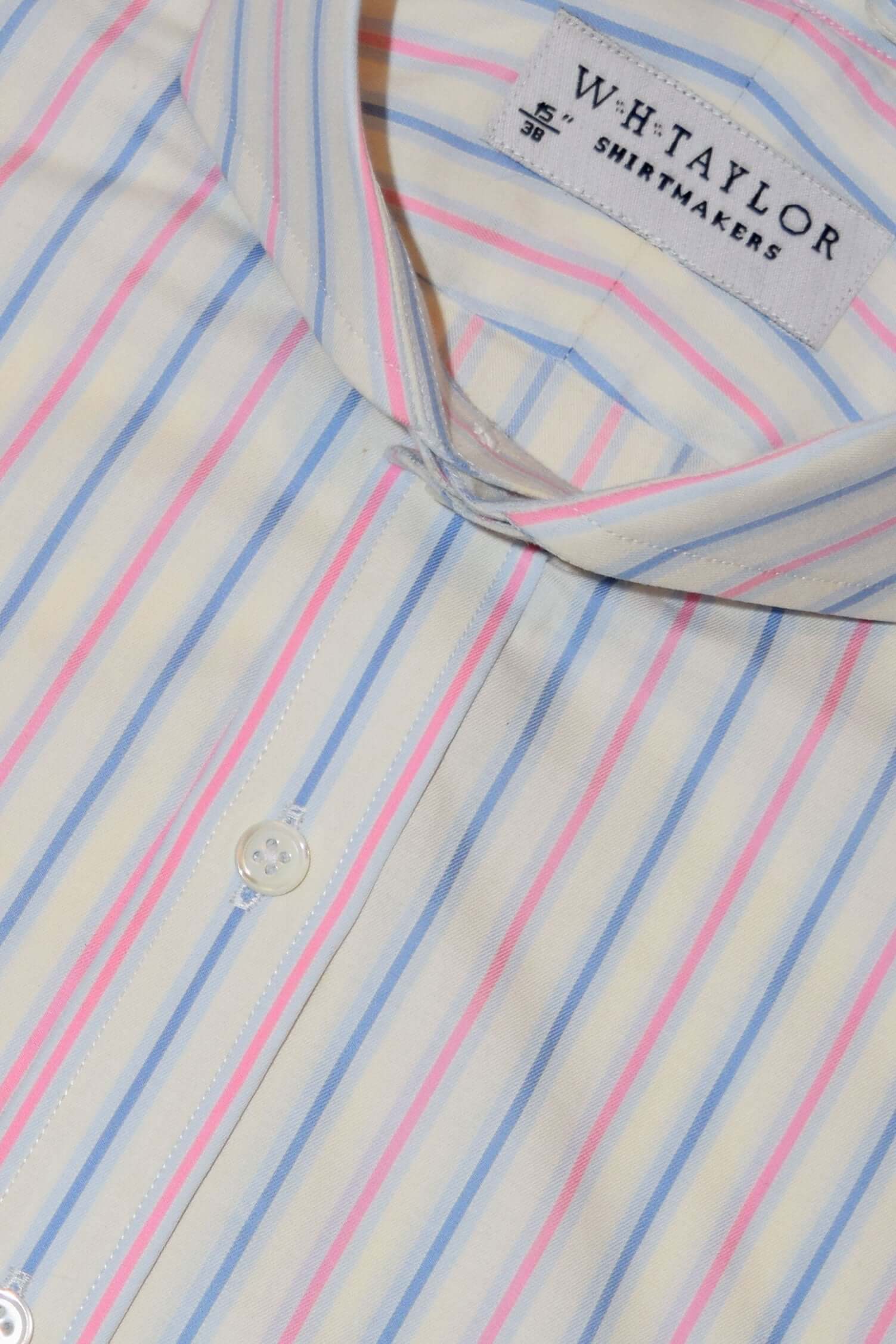 クラシックなブルーにネイビーとホワイトのピンクのストライプが交互に描かれたこのシャツは、普通のスタイルに間違いなく興味深い要素を加えています。